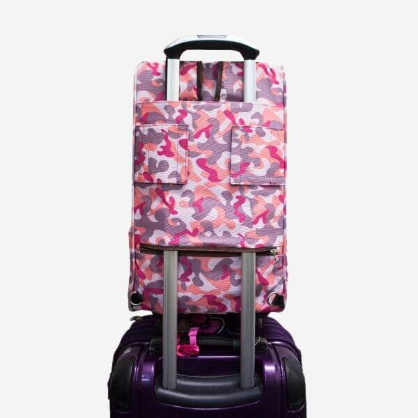 - A large pocket on the back that turns into an insert to put on top of your luggage by unzipping the bottom of the pocket